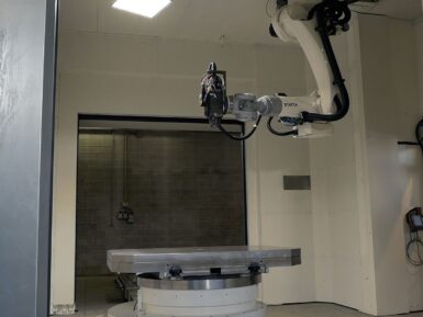 Anschließend werden die Materialien von einem ersten KUKA-Roboter (Modell QUANTEC KR 270 R2700) bearbeitet, der von der Decke herabhängt, um mehrere Stellen in der Zelle zu erreichen. Die Bearbeitung wird durch den Drehtisch erleichtert, der die verschiedenen Flächen des Werkstücks vor dem Roboter positionieren kann. Die wichtigsten Bearbeitungen an Verbundwerkstoff-Karosserien sind Fräsen, Bohren, Entgraten und alle anderen vom Kunden geforderten Sonderbearbeitungen, wobei die Möglichkeit besteht, spezielle Werkzeuge zu installieren, um diese Bearbeitungen zu automatisieren, die früher manuell durchgeführt wurden.