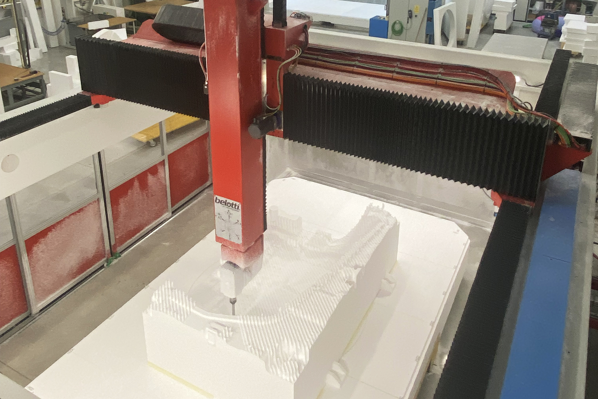 Polystyrene model milling operations are carried out using a Performance Head with 15 kW and 18 kW electrospindle, supported by a pneumatic locking system for the rotary axes.