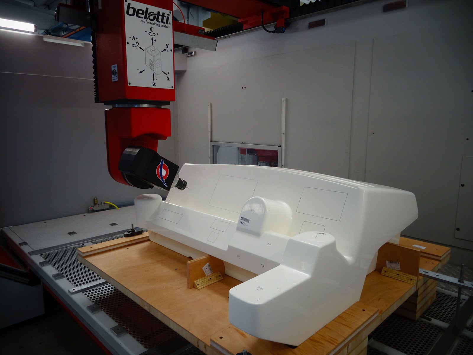 Centri di lavoro a 5 assi ad alta velocità per la rifilatura in serie di componenti in materiali compositi e termoplastici e per la fresatura di modelli in resina o leghe leggere.