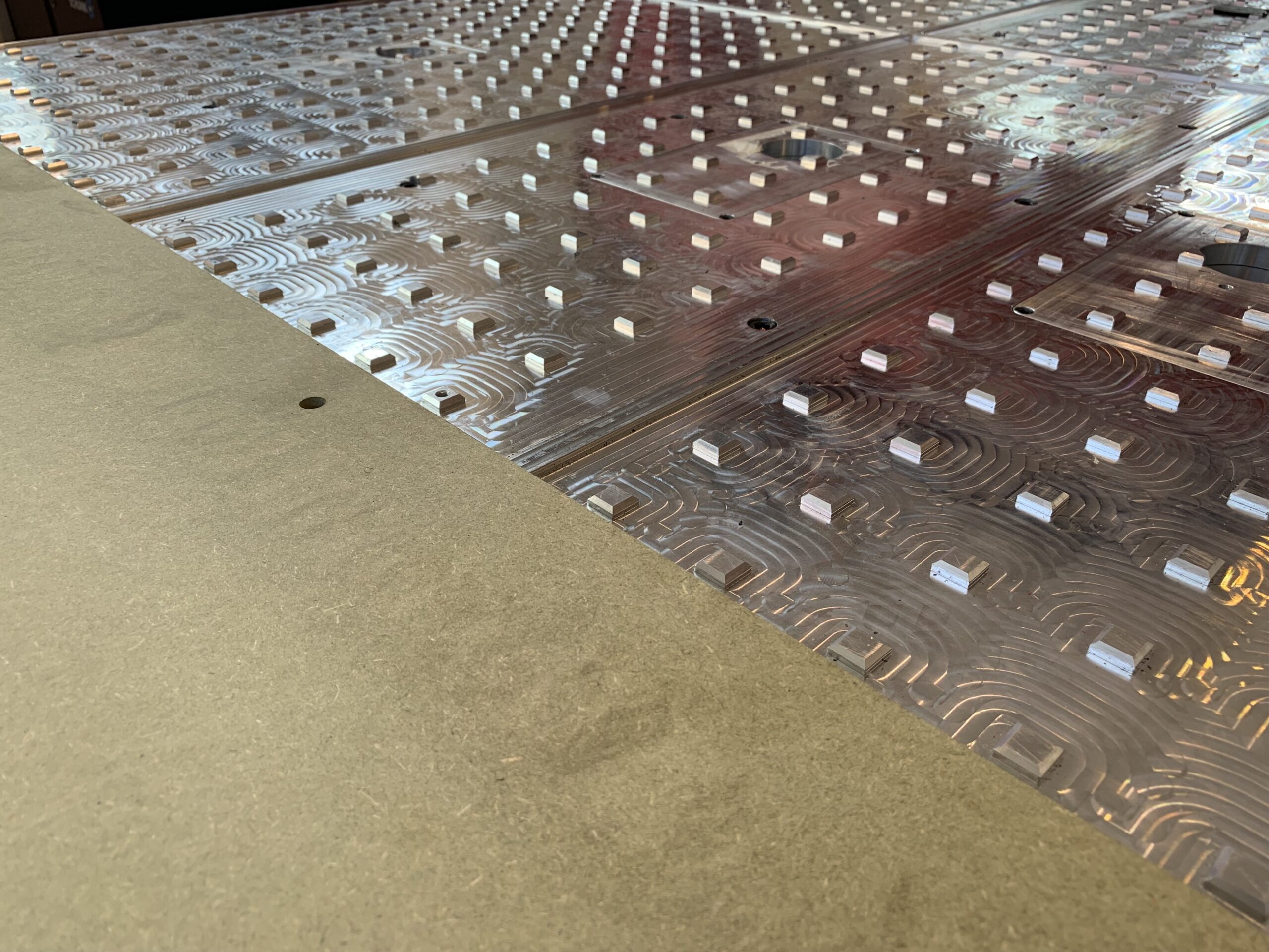 Piano in alluminio su cui vengono avvitati i pannelli in materiale MDF (medium density), progettati appositamente per la lavorazione di piastre in alluminio.